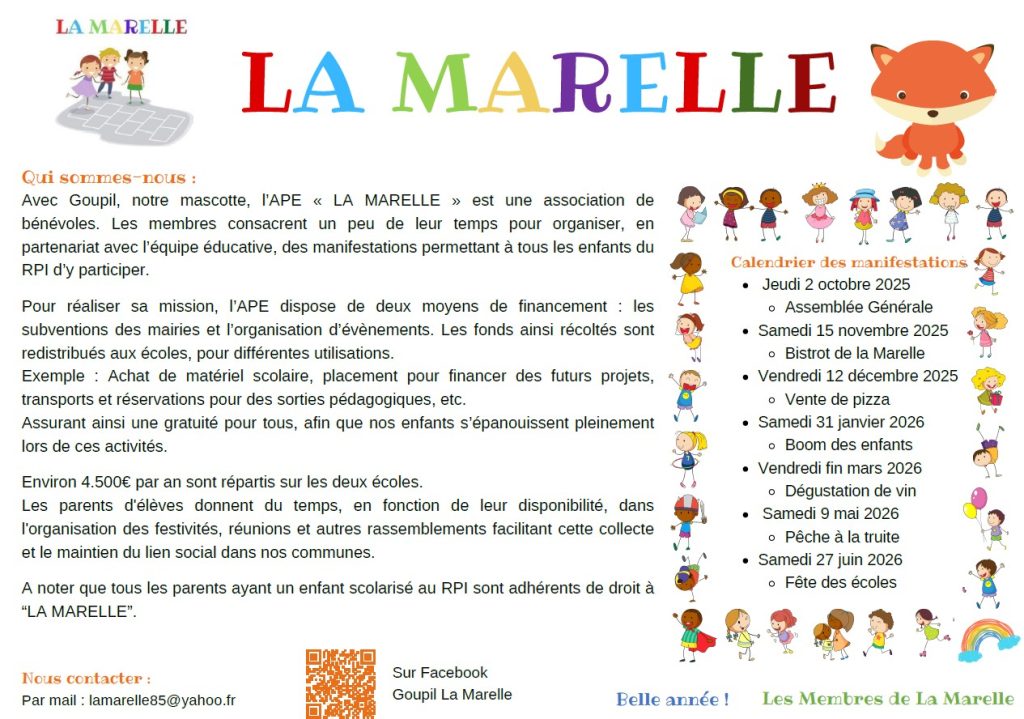 « La Marelle » est l’association des parents d’élèves du RPI St Juire Champgillon – St Martin – La Réorthe, qui organise différentes actions au bénéfice des coopératives scolaires pour financer des sorties ou permettre la réalisation de projets par et pour les élèves.